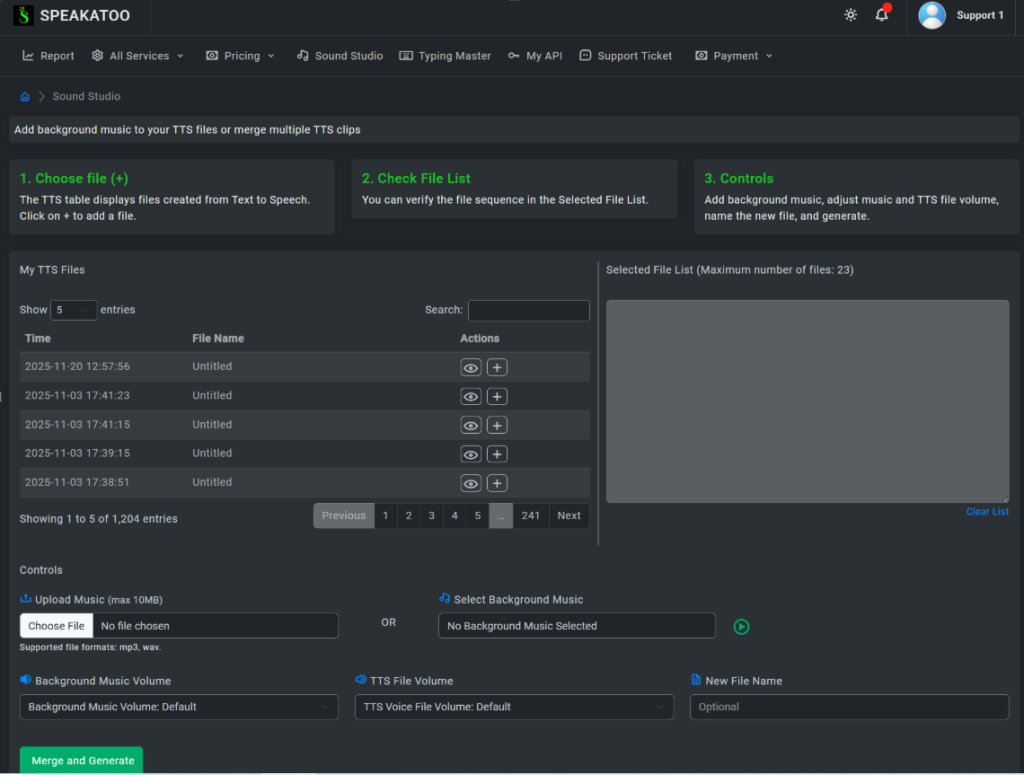 Speakatoo Sound Studio is designed to help users add background music, merge multiple TTS files, adjust audio levels, and produce a polished final audio output—all without needing professional editing skills. For creators, marketers, educators, and businesses, this tool becomes a complete audio solution.