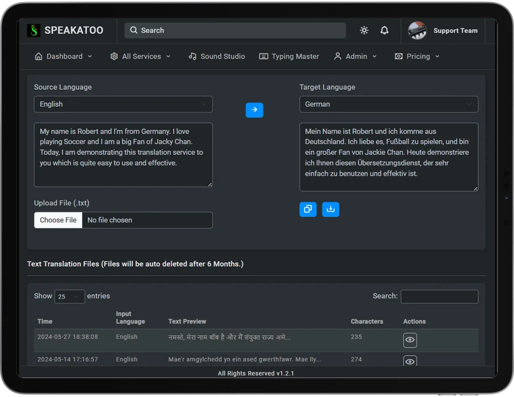 Speakatoo’s Text Translation service is a cloud-based platform that allows users to translate written text from one language to another instantly. The service supports multiple languages and uses advanced linguistic models to maintain meaning, tone, grammar, and sentence flow.